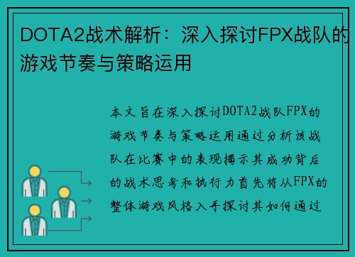 DOTA2战术解析:深入探讨FPX战队的游戏节奏与策略运用